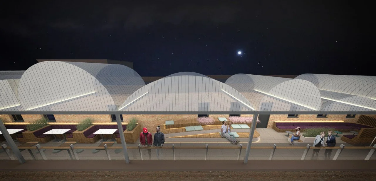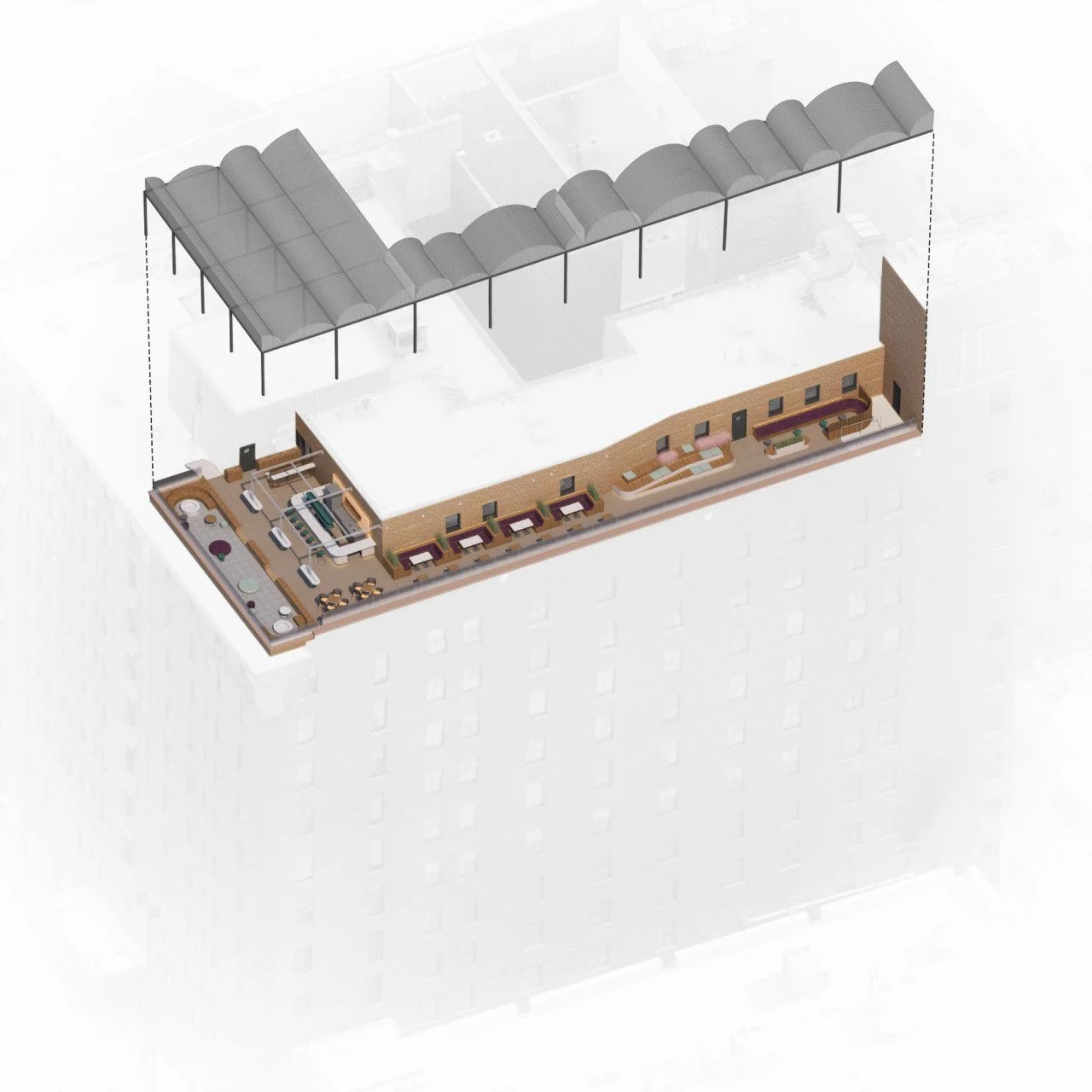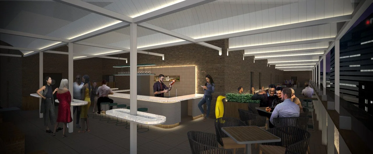 Schematic design and pricing package for improvements to existing rooftop cocktail lounge. The design provides built-in climate enhancing features to extend the seasonal use of outdoor space. Features include a new outdoor bar area and enhanced seating varieties throughout the terrace. Entry and circulation patterns are modified to improve accessibility and guest experience.