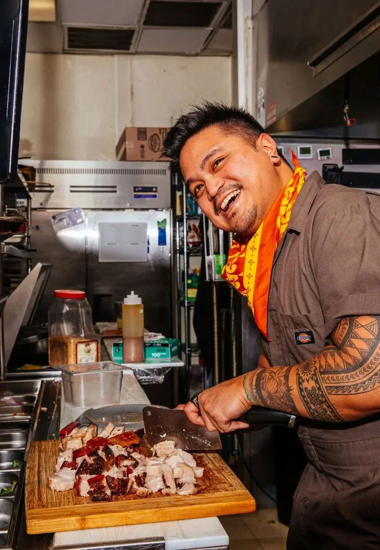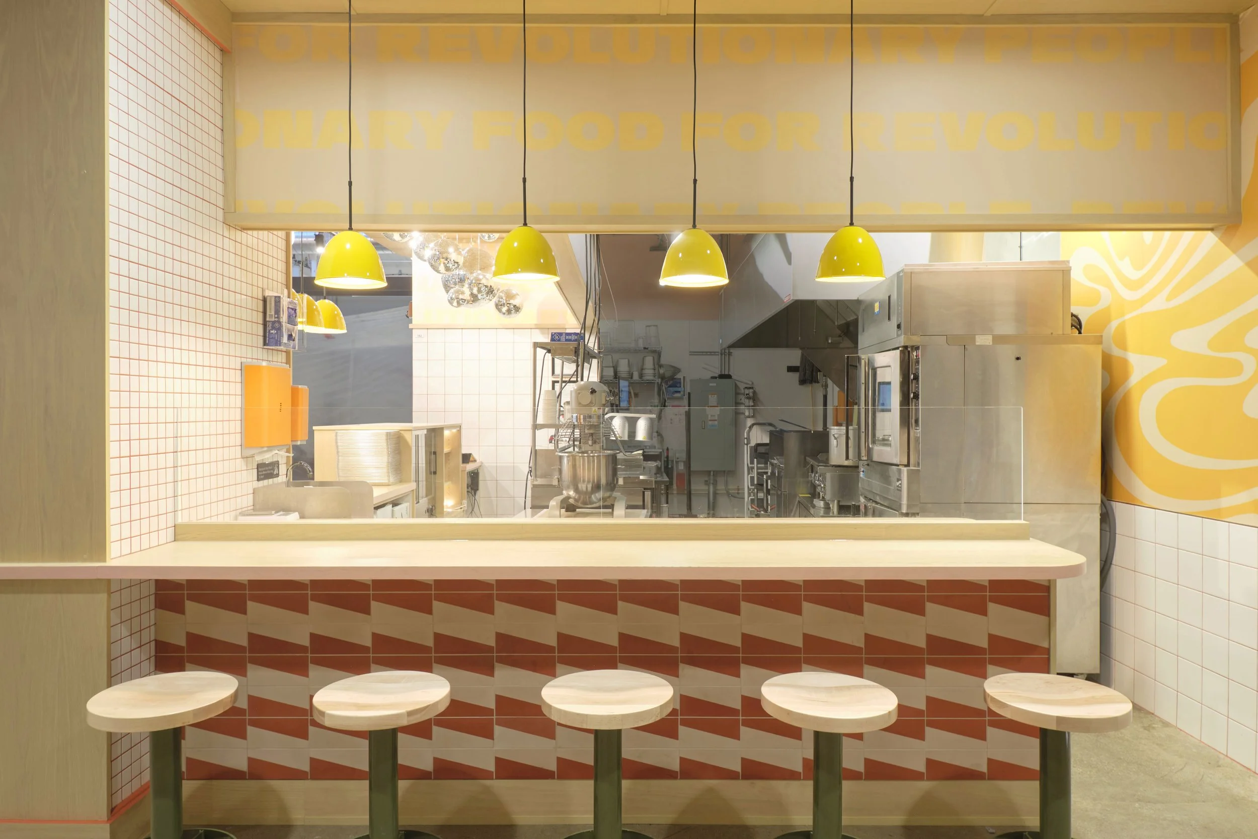 Spatially, there were some interesting challenges to overcome. By nature, a food hall stall needs to function at a similar capacity to a full restaurant while occupying only a fraction of the space. We sought to maximize the depth of the shallow footprint through multiple means. Carefully layering many colors, textures, lighting, and materials invites passersby from across the food hall into a surprisingly immersive experience. The back-of-house space, usually behind closed doors, is open to the customer’s view to see the full cooking experience, cooks share a counter space with customers eating, further establishing a conversation between the people making the food and the people eating the food.