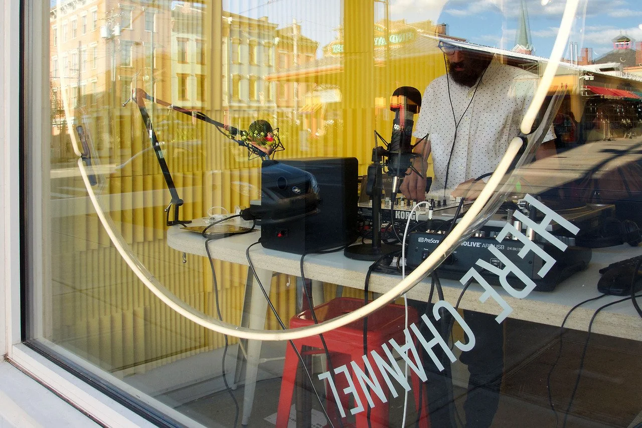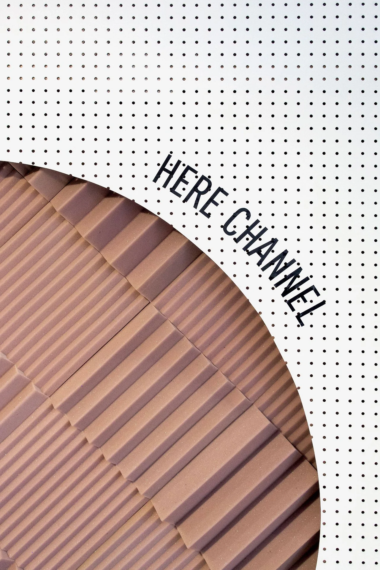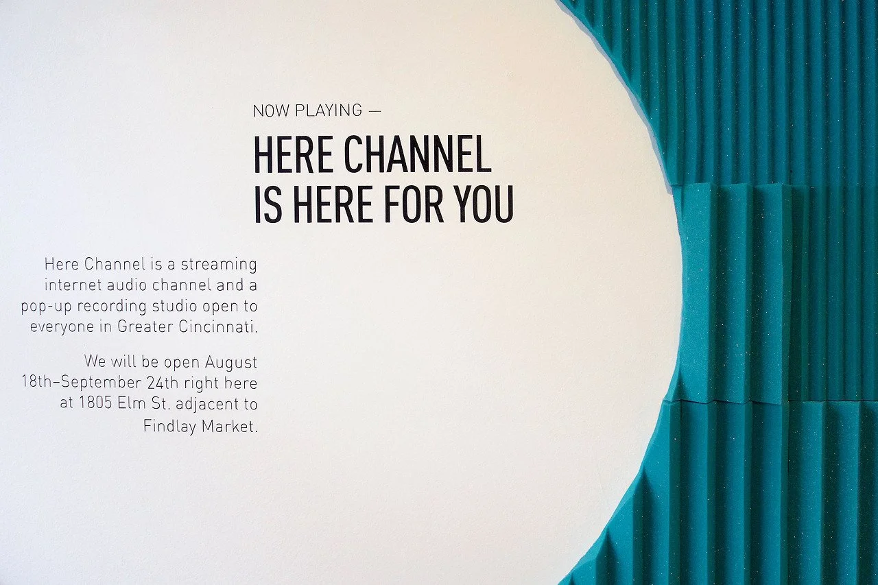 Here Channel is a project by Caroline Creaghead that invites everyone in Greater Cincinnati - regardless of age, experience or anything else - to create and stream audio content of any kind. It provides independent creators with the gear, the know-how, and access to a platform on which to be heard. In collaboration with graphic design by Josh Jacob of Cosette and fabrication by Branden Francis of Sediment, Team B produced an energizing and inviting functional space for the community to learn, record, and broadcast their voices.