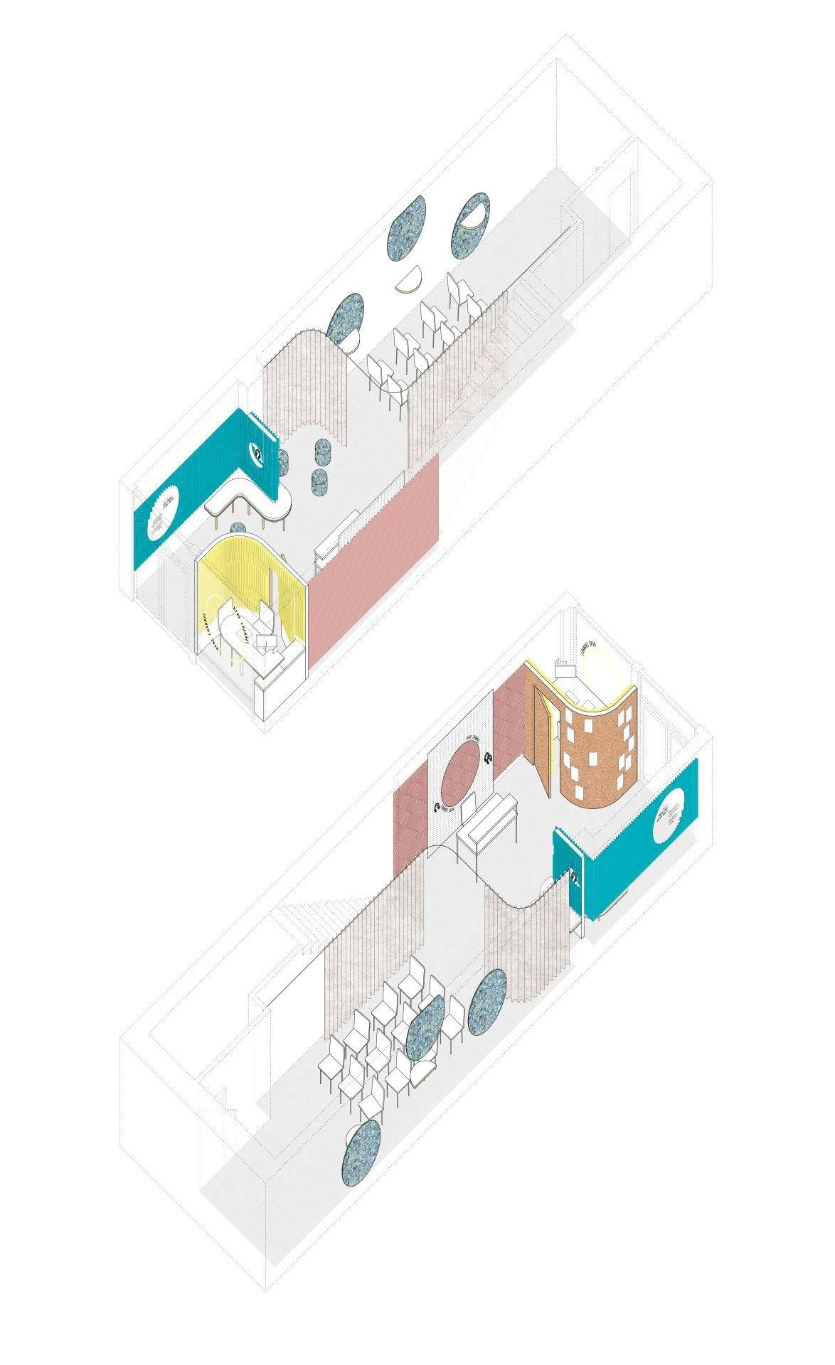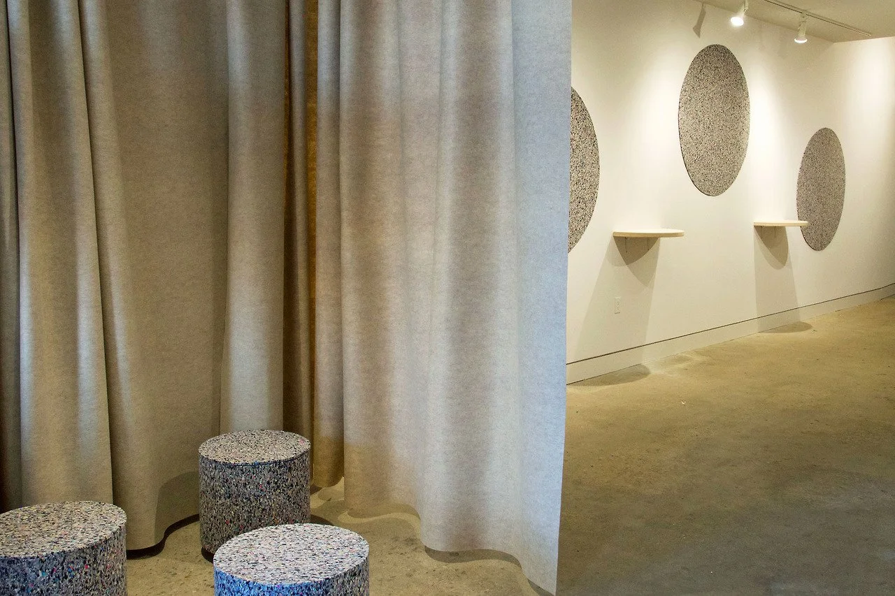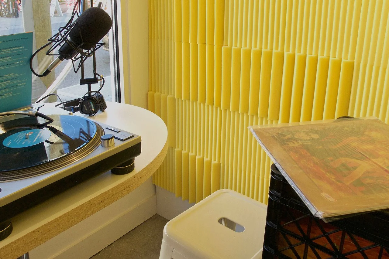 The design focused on creating a vibrant, textural and acoustically performative environment. The project was also operating on a tight budget, making it important to use affordable materials, but elevate them through detail and application. Acoustic foam in varying colors and wedge profiles defined three main spaces - the entry and lounge, the reception desk, and the recording booth - while a track of thick felt curtain was able separate a multifunctional performance space in the back. The bold graphic patterns of carpet padding and pegboard served as accent and overlay wall materials and were used create rolling stools for the lounge. The recording booth itself faced the storefront window, showcasing the activity within to the public and inviting curiosity into the space.