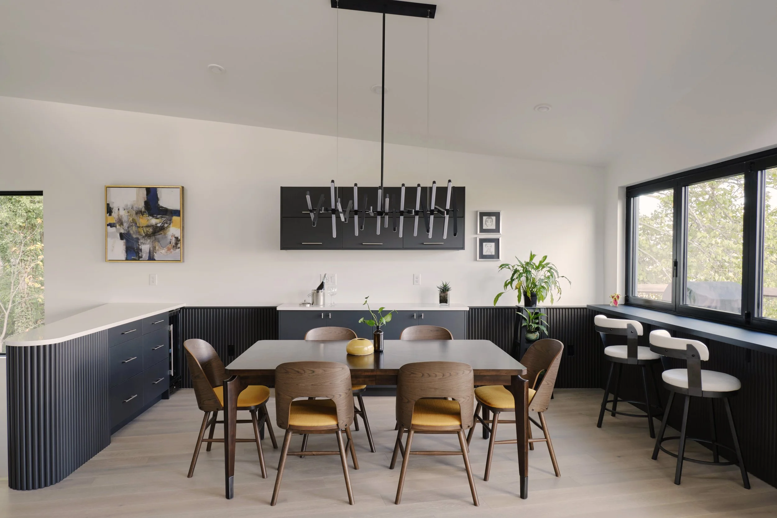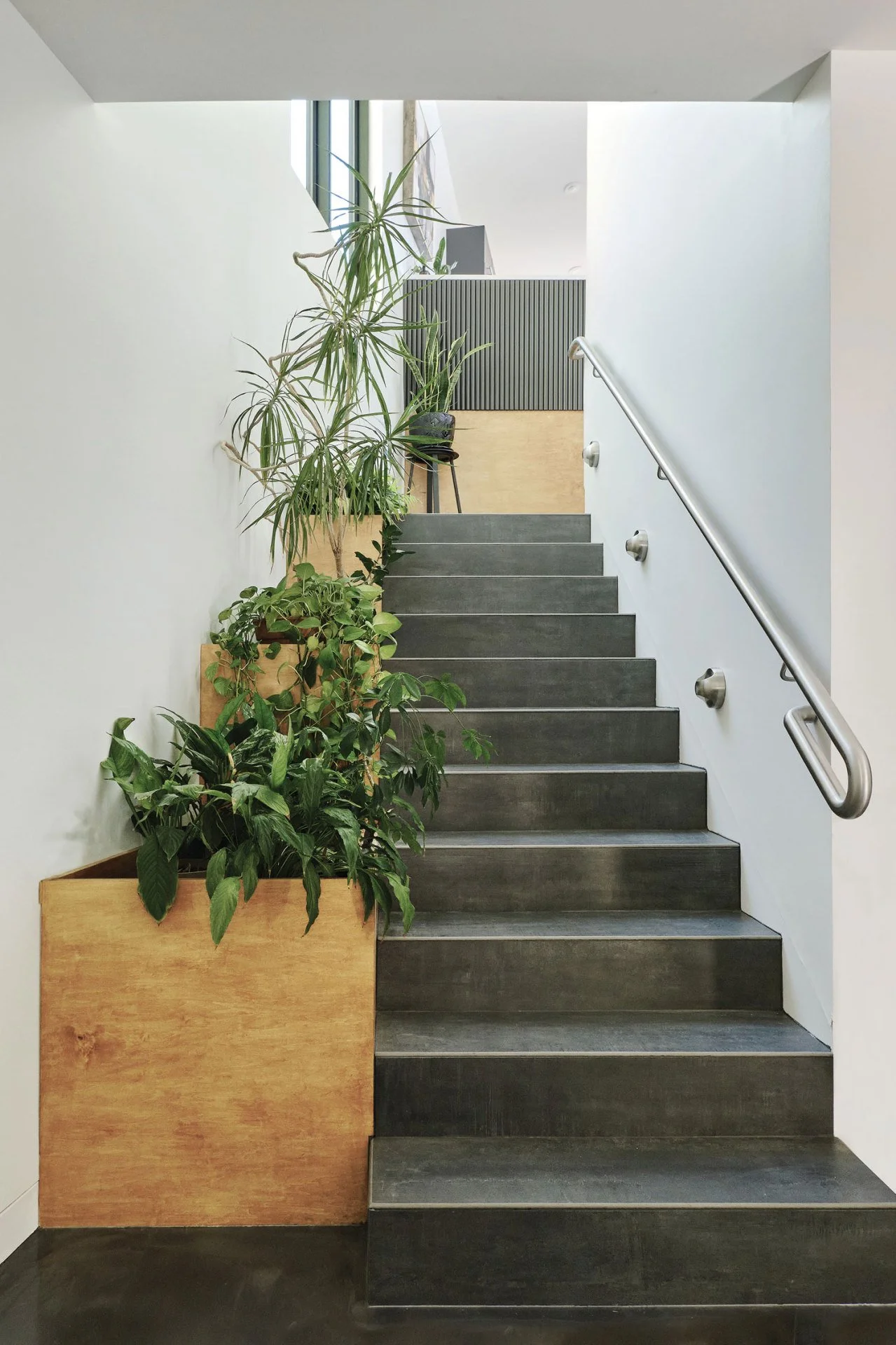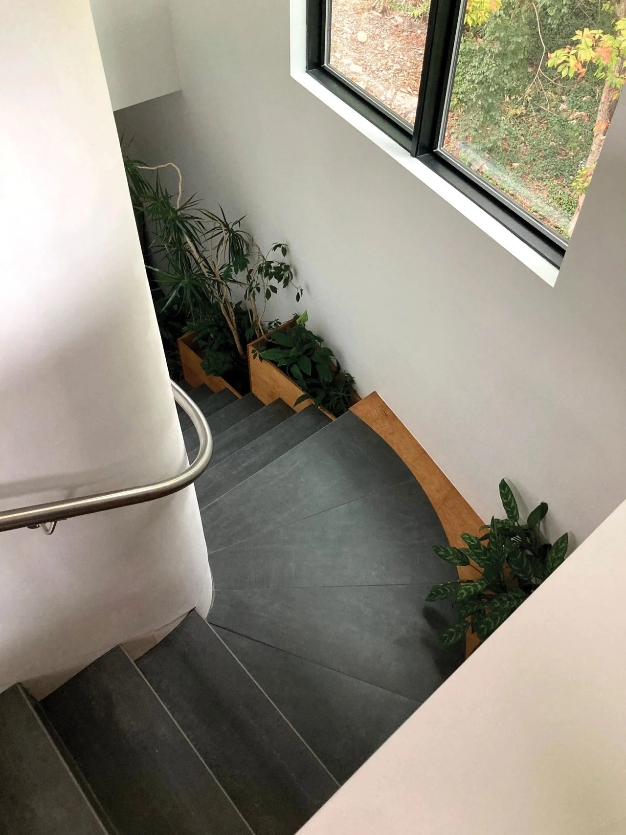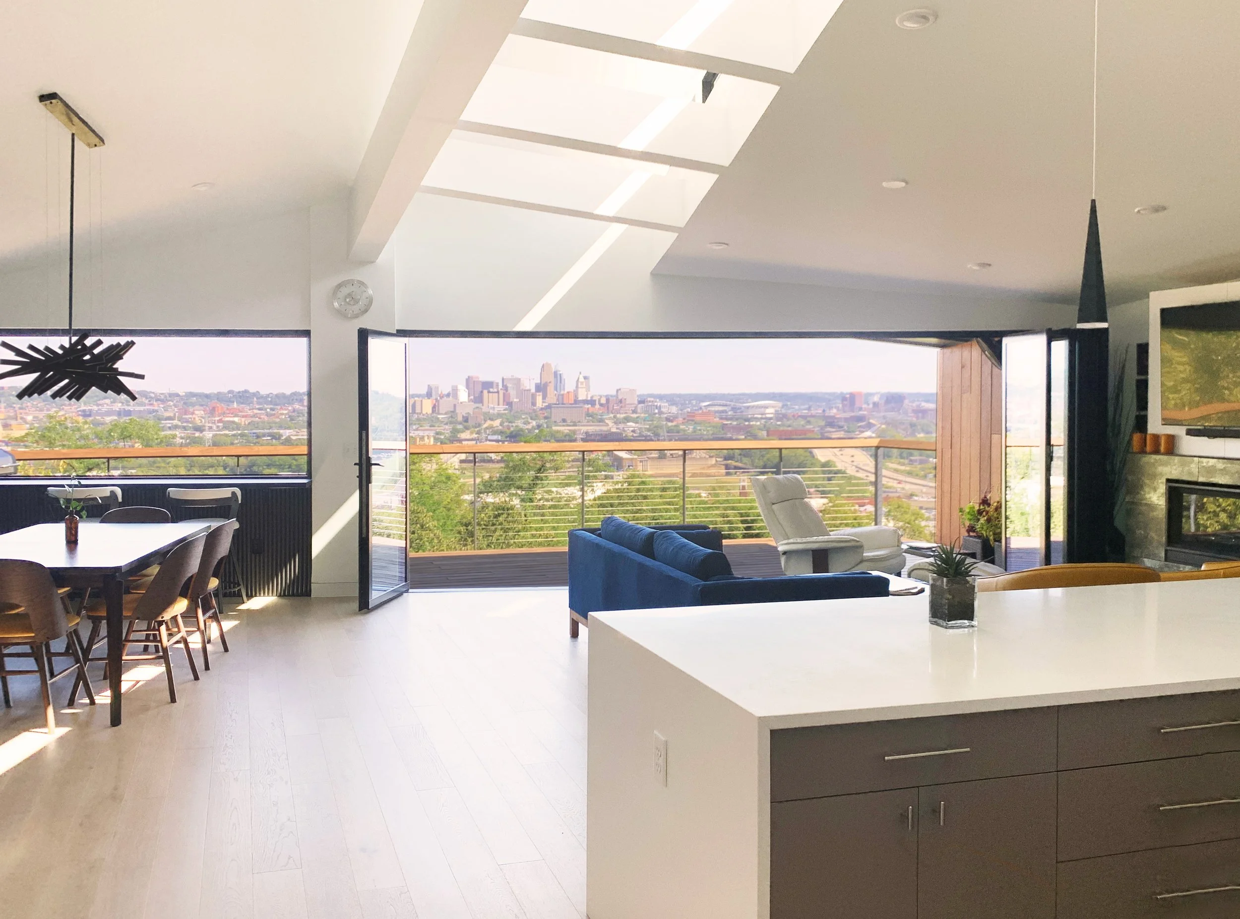 Guest bedrooms and storage are reserved for the ground floor, with a custom-detailed sculptural stair leading to upper level social spaces where a full panoramic view of the city and river unfolds. With a flush exterior deck, the living room extends to the exterior during warm months.