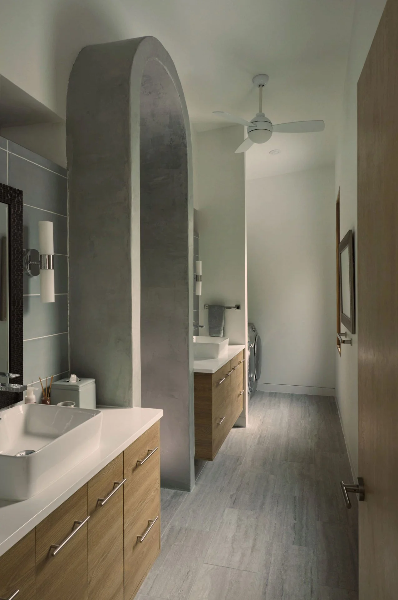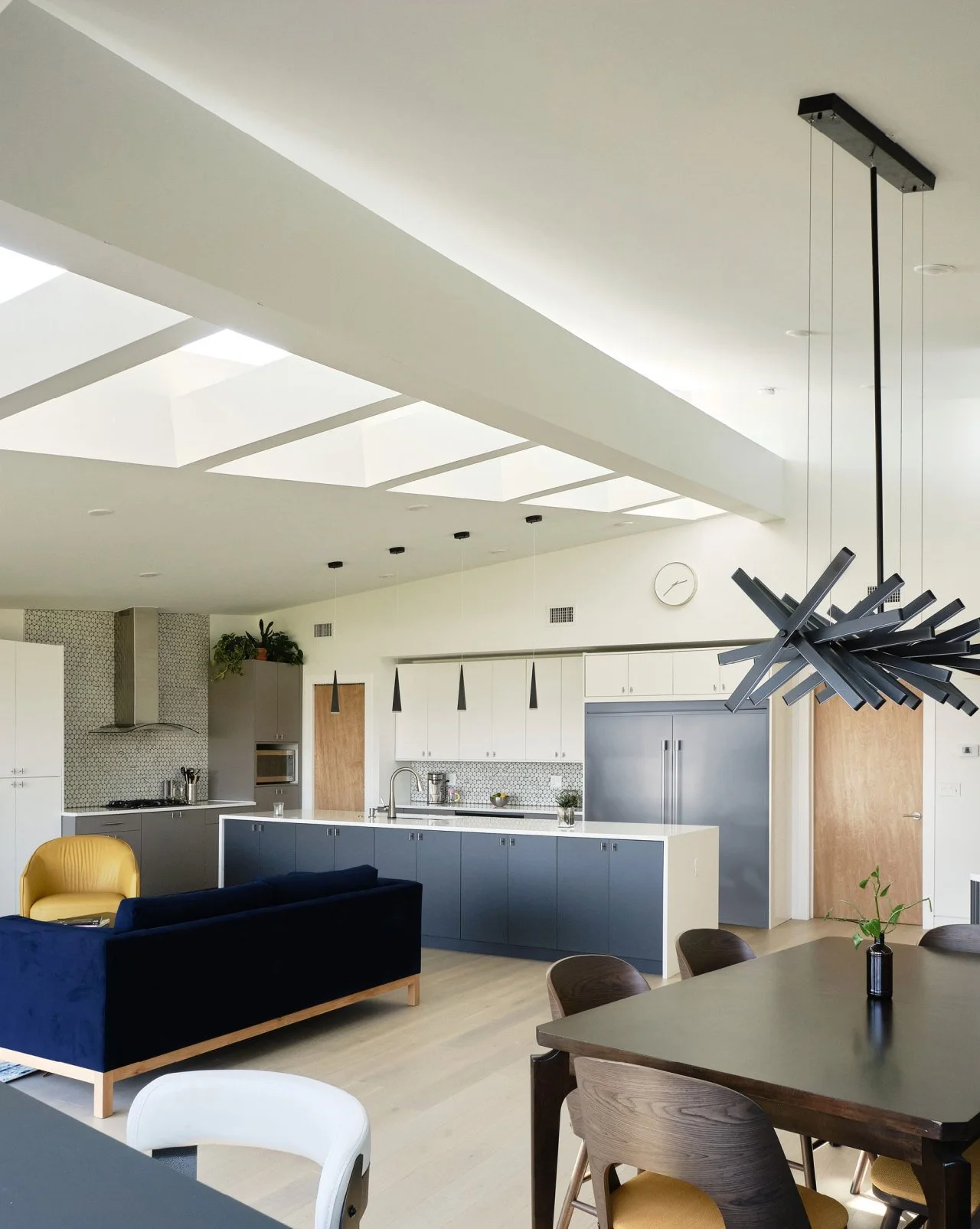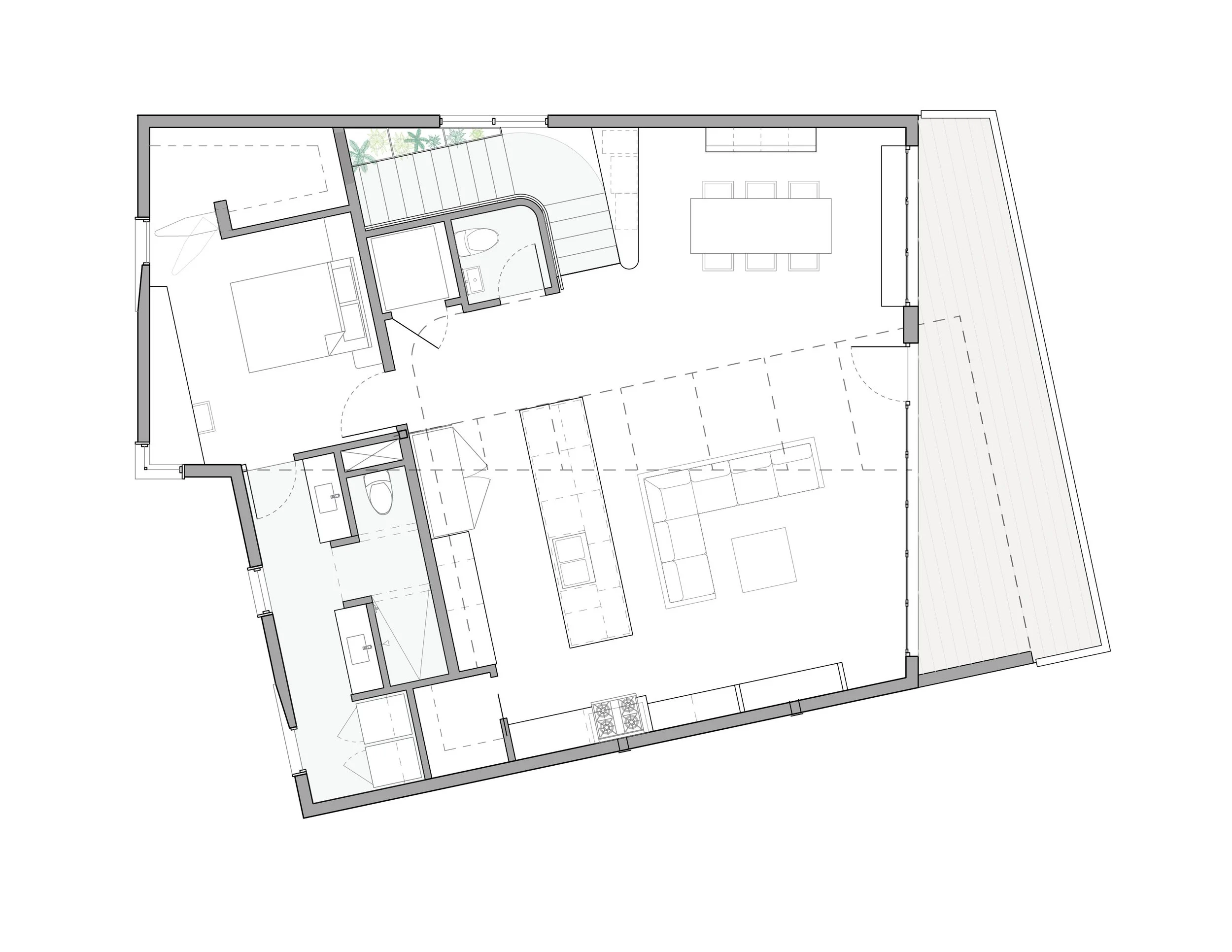 The house sits at the end of a row of modest shotgun houses, punctuated by odd window openings and siding patterns. Cedar cladding and a grab bag collection of window types riff off this immediate context. Two volumetric masses are asymmetrically rotated to accommodate both contextual street grid and property boundaries. The joint between the two volumes is articulated in a large interior clerestory window daylighting living and kitchen spaces below. This element forms an axis leading to the primary bedroom suite tucked away behind more active living areas.