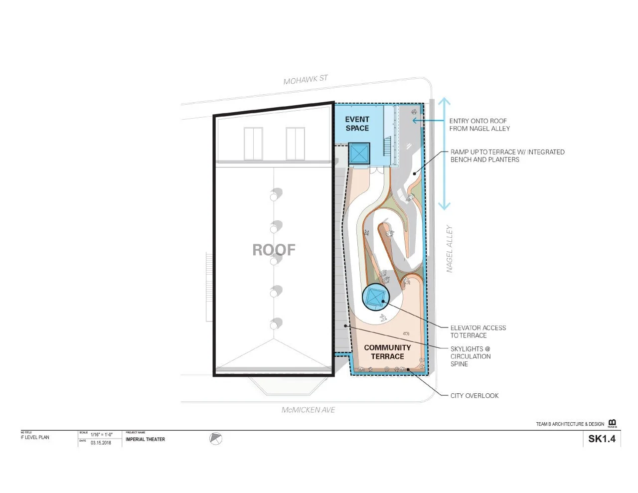 Due to the sloped site, the rooftop can be accessed from the rear alley entrance, and from the building. From the alley entrance, a serpentine ramp creates a meandering path with spaces for community garden plots, opening up to a rooftop space that houses the full community garden and an outdoor gathering space that links to an event space in the rear.