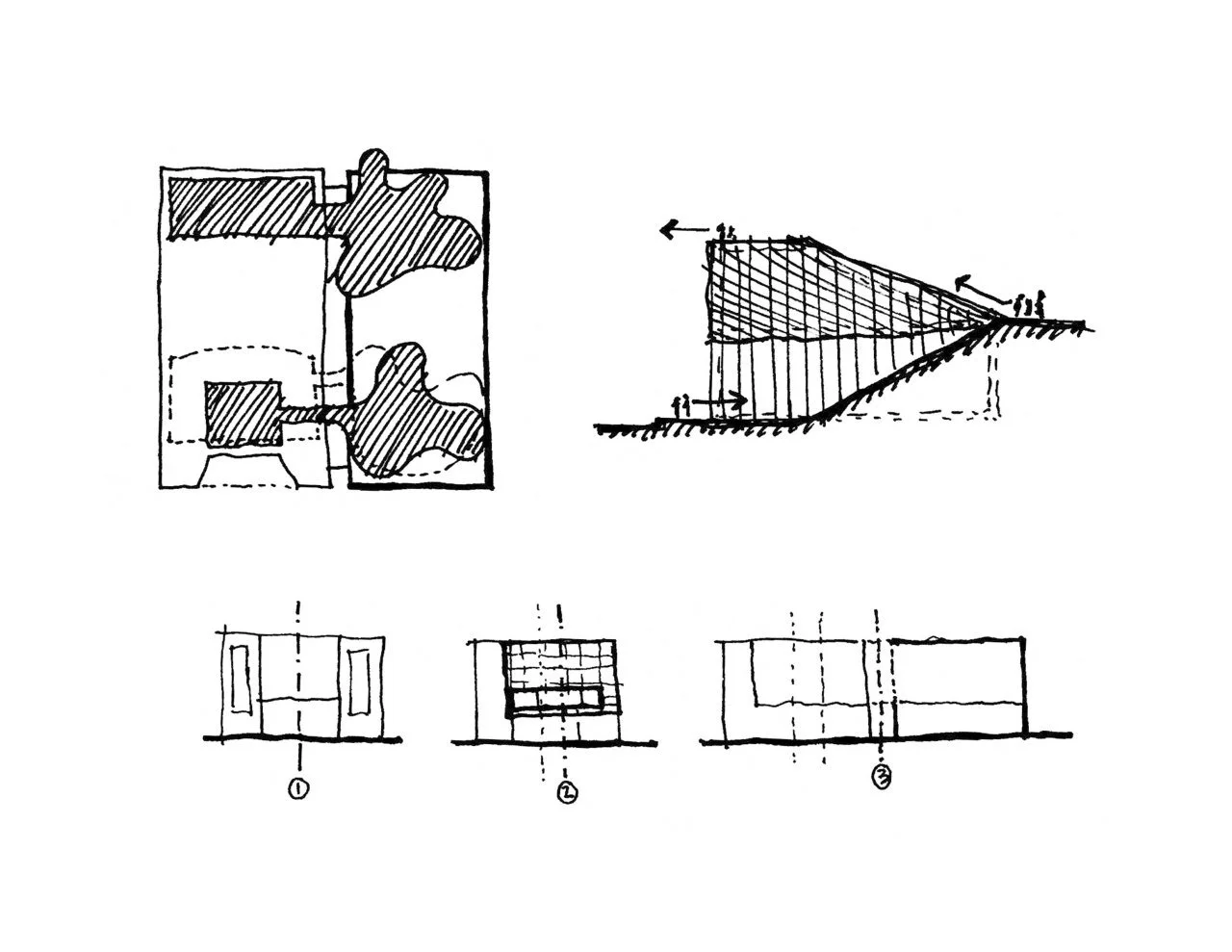 Programmatically, the spaces within the new construction compliment the adjacent existing space, with the levels of the new construction aligning with the sloping theater and the raised stage. A new lobby creates a main entrance space with a cafe that expands the building’s hours from a traditional, formal, evening event space to a casual, daytime use. A new props shop buried into the hill allows set design and production to happen in house.